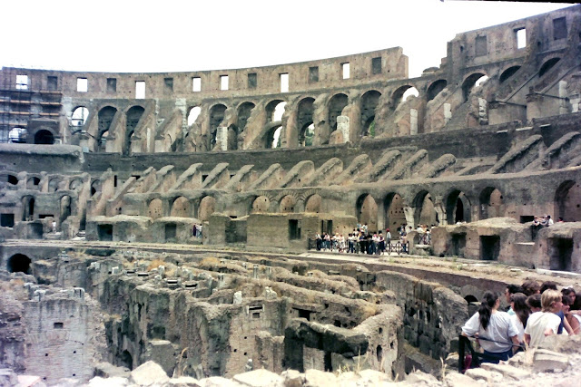 La tarde fue exhaustiva, después de comer al Coliseo ¡Qué proporciones! Y que pena que no tenga en el interior algún tramo de entarimado, mejoraría mucho si terminaran la reconstrucción parcial del interior. De allí por la Via del Foro y pasando debajo del arco de Tito (el de Constantino estaba en restauración) entramos en el foro que te transporta de época, desde allí ves las colinas, el Palatino, el Esquilino, la Domus Aurea de Nerón, el palacio de Augusto, el templo de Vesta etc. Desde el foro a las termas de Caracalla pasando por el Circo Máximo y por Via Druso y Via Appia Antica, las termas son grandiosas. Habían colocado un escenario de ópera y unas gradas en alto para el público, la decoración era gigantesca, para Nabuco y Aída. Los mosaicos y los capiteles son increíbles, sobre todo uno en el que se representa en medio relieve a un fauno de cuerpo entero.