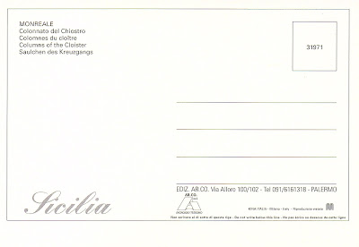 La montaña de Monreale es de color ocre, con calles empinadas, en la parte alta la catedral. Primero vamos al claustro que fue benedictino, tiene los típicos capiteles románicos, con sus columnas pareadas sobre un murete, los fustes se alternan, unos lisos y otros con alicatados de mosaicos dorados, rojos y negros con motivos geométricos, igual que la decoración de las arquivoltas, que tienen puntas de diamante, bolas y motivos geométricos. En las esquinas cuatro columnas con los fustes decorados iconográficamente (apóstoles, vida de Jesús, monstruos...).