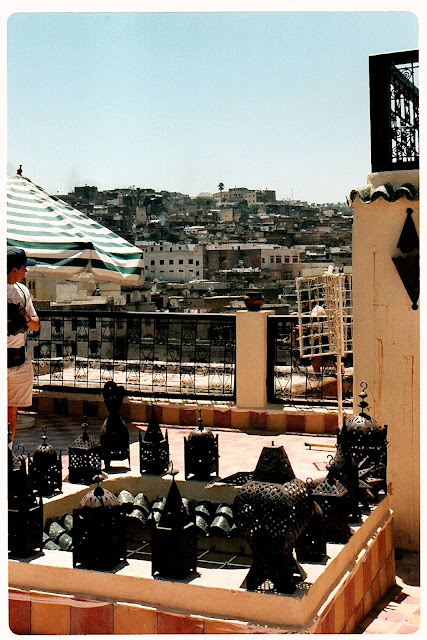 Después fuimos a un mirador desde donde se veía la ciudad entera, en una parte alta, una de las colinas, la ciudad francesa donde está el hotel, entre dos colinas de la zona de Fez el Jdid, del siglo XIV y a continuación en la zona más baja la Medina Fez el Bali encerrada por la muralla y en la hondonada, al lado del río. Al lado de cada puerta un cementerio, sin tapias, sólo las tumbas desordenadas. El color es ocre, en las colinas hay olivos junto a los cementerios, restos de la alcazaba y de otra muralla periférica. Decía el guía que la vista se parecía al mirador del Albaicín, pero a mí no se me pareció nada, más bien se e parecía a Jaén. El guía no había estado en España nunca. Al fondo se veían las nubes de humo de los alfareros que cuecen las piezas con orujo.