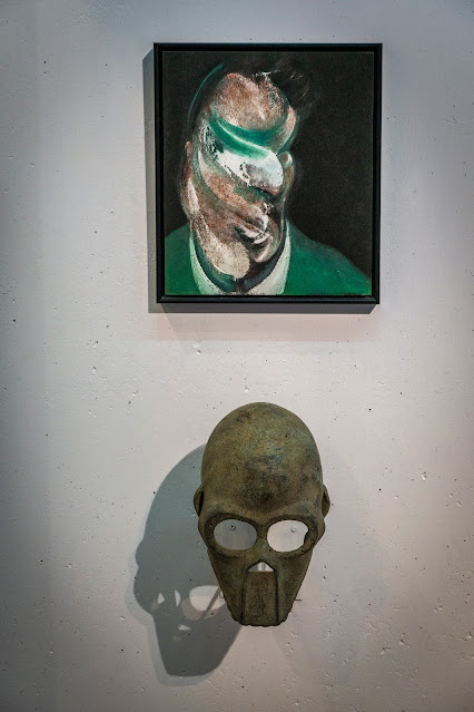 Esculturas de plástico reciclado y presidiendo al fondo de la sala un muro de cristal Swarovski que proyecta luz detrás de un esqueleto de rinoceronte. Unos tótems de Papua Nueva Guinea, objetos de caucho que parecen cerámica negra, dodecaedros de madera y metal y máscaras africanas.