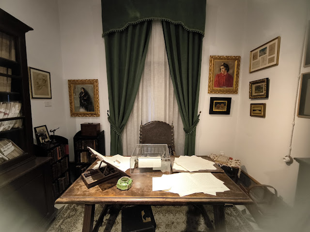 Cuando volvemos ya está más despejado. Esta es la casa donde vivió el poeta desde los seis años hasta que se fue de Moguer por primera vez, casa que conservó toda la vida, y que en vida del poeta el Ayuntamiento decidió dedicar a sus libros y objetos. Juan Ramón mandó revistas y libros a la casa para completar los enseres. Nos ponen un documental muy interesante y después nos dice la guía que esta no fue su primera casa, la primera estaba en el barrio marinero porque su padre era comerciante de vinos, pero se mudaron pronto al cegarse el puerto de Moguer y porque el barrio no era muy agradable, sobre todo teniendo en cuenta la hipersensibilidad de Juan Ramón que olía, oía y gustaba más que nadie, incluso había olores que le hacían desmayarse y marearse.