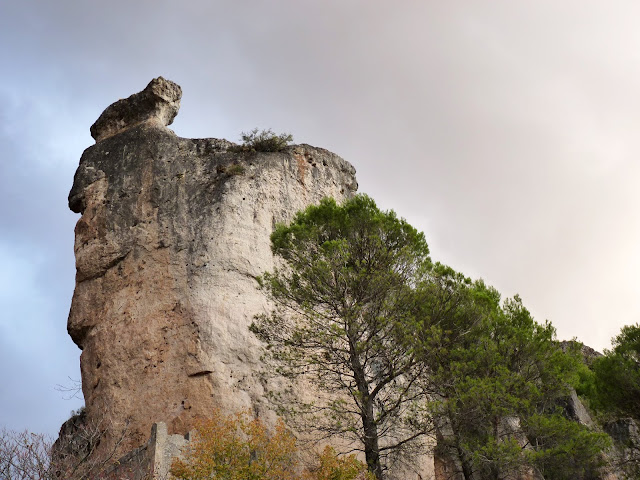 Por una calle estrecha que baja en paralelo a la plaza vamos paseando hasta la Ermita de las Angustias entre paredes verticales de roca y hojas amarillas que tapizan el suelo. Pasamos por delante de la casa Zavala donde está la colección Antonio Saura y muchas casas imponentes con jardín que dan a la hoz del Júcar. Por cierto, desde la plaza Mayor no se puede bajar al puente porque está en obras.