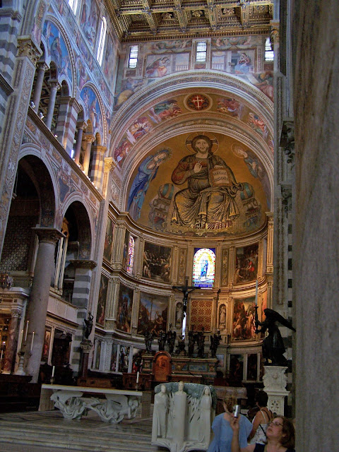 Después fuimos a Pisa, siempre hay que volver a Pisa y disfrutar del magnífico conjunto de catedral, baptisterio y campanario, independientemente de que éste sea el campanario más famoso del mundo por estar inclinado. La catedral románica se encuentra en el centro de la plaza de los Milagros y a uno y otro lado se encuentra la torre inclinada (il campanile) y el baptisterio, hay muchas cosas que observar en estos tres edificios como el púlpito o los impresionantes relieves de las puertas de bronce.