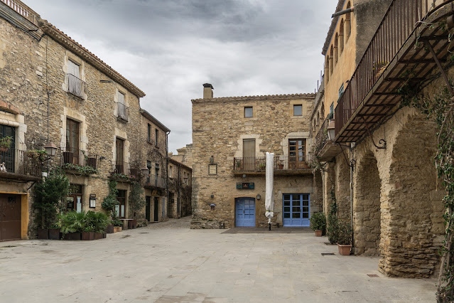 Seguimos a Peratallada donde ya habíamos estado y nos había encantado y ahora también, es un 9 y no es un 10 por el emplazamiento que es más llano, aunque tenga una subidita al castillo y a una iglesia. En la plaza hay unas arcadas apuntadas muy bonitas, unas casas y puertas de las casas de mucho valor y gusto. Tiene torre del Homenaje y muralla completa que conserva perfectamente, así como varias torres. Está animado, hay visitantes y algunos cafés abiertos y bastantes restaurantes. Está nublado, pero no llueve.