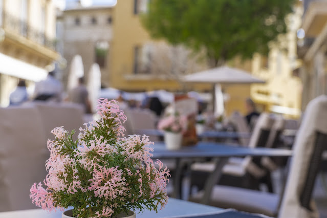 Esta tarde al Port de Pollença, nos hemos recorrido andando todas las playas y el paseo. Los bares y restaurantes están preciosos. Hemos tomado café en uno que se llama Capuccino, sillones con cojines blancos y rojos en la terraza, veladores de mármol, sombrillas con maceteros de geranios y otra terraza avanzada sobre el mar. En el interior un salón con unos sofás comodísimos, estanterías con libros y al fondo una gran estantería con bobinas industriales de hilos de colores en una gama de rosas y rojos. Los lavabos con lavamanos de mármol redondos de una pieza y aislados de la pared, algo muy notable y muy de mi gusto.